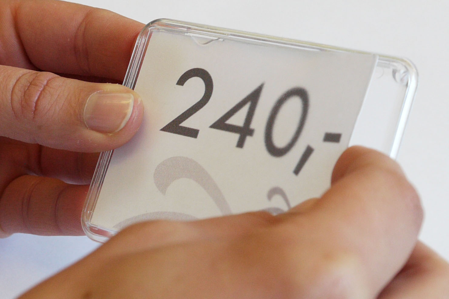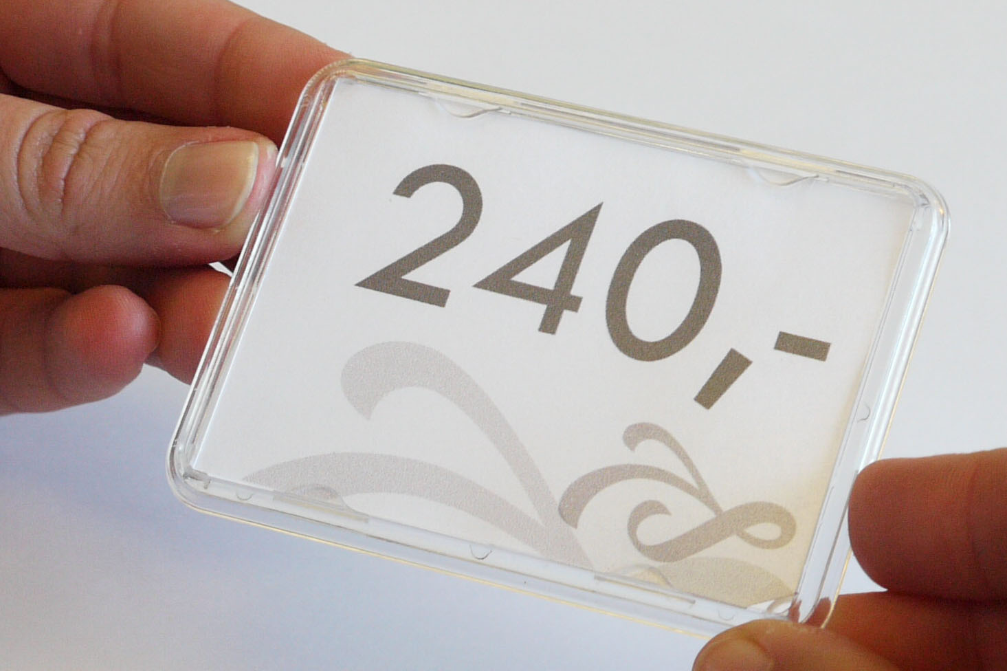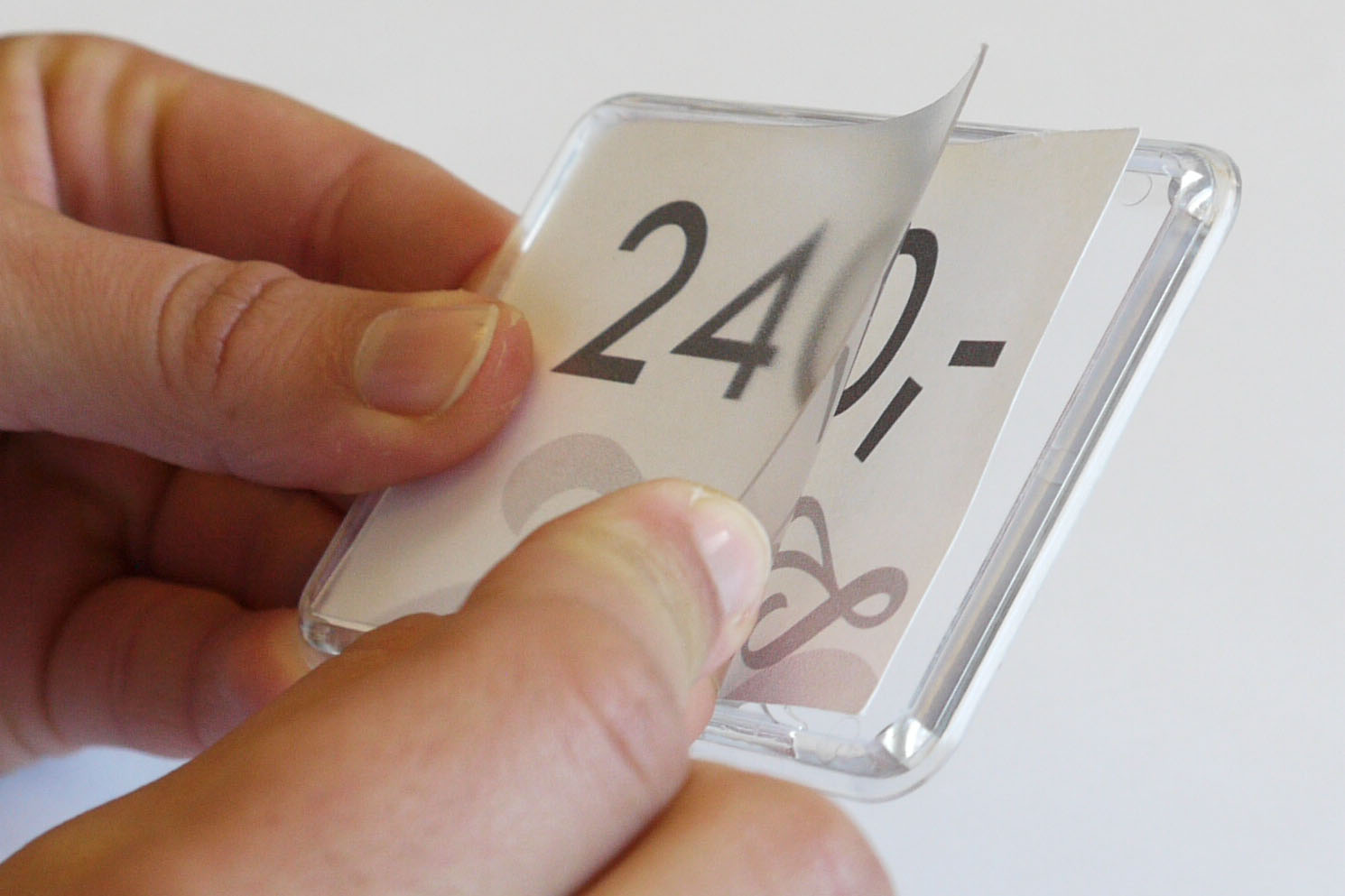 Günstige, transparente Kleberahmen für Sicherheitsbeschilderung, als Preisschild, Produkt- oder Speisenkennzeichnung und Alternative zu Scannerschiene, für Montage auf glatten Oberflächen.