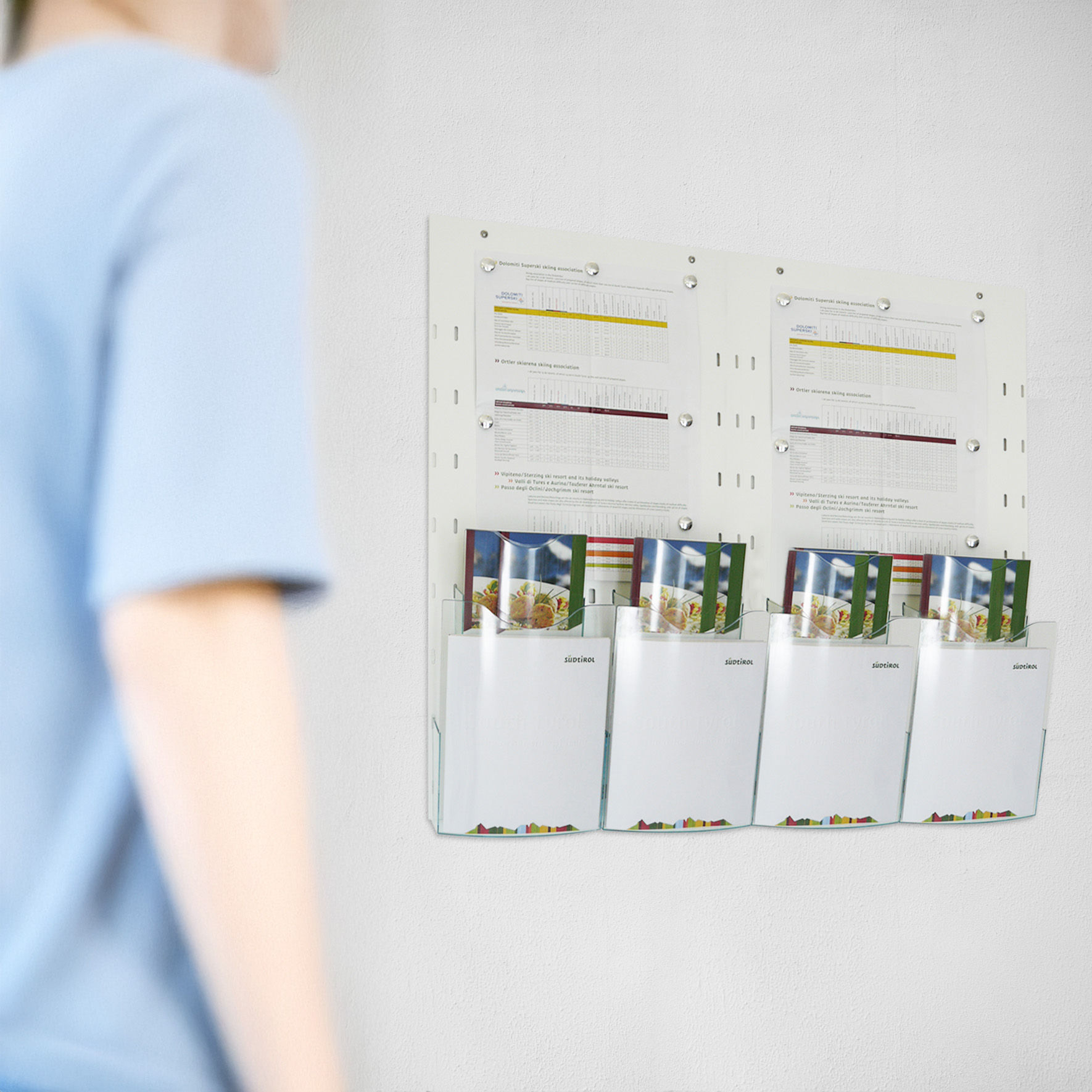 Infowand, Regal, Prospekthalter oder Magnettafel? Mit Magic Board müssen Sie sich nicht entscheiden, denn das clevere Modulsystem kann all das und noch viel mehr! Durch die vielfältigen Accessoires der Magic-Linie können Sie sich Ihr Präsentations- und Informationsboard genau so gestalten, wie Sie es gerade brauchen. Prospekttaschen, Info-Displays und Objektablagen können mühelos in die Fräsungen ein-, aus- und umgehängt werden. Das Modulsystem von Magic Board: unbegrenzte Möglichkeiten für Ihre Kreativität im Office- und Homebereich.