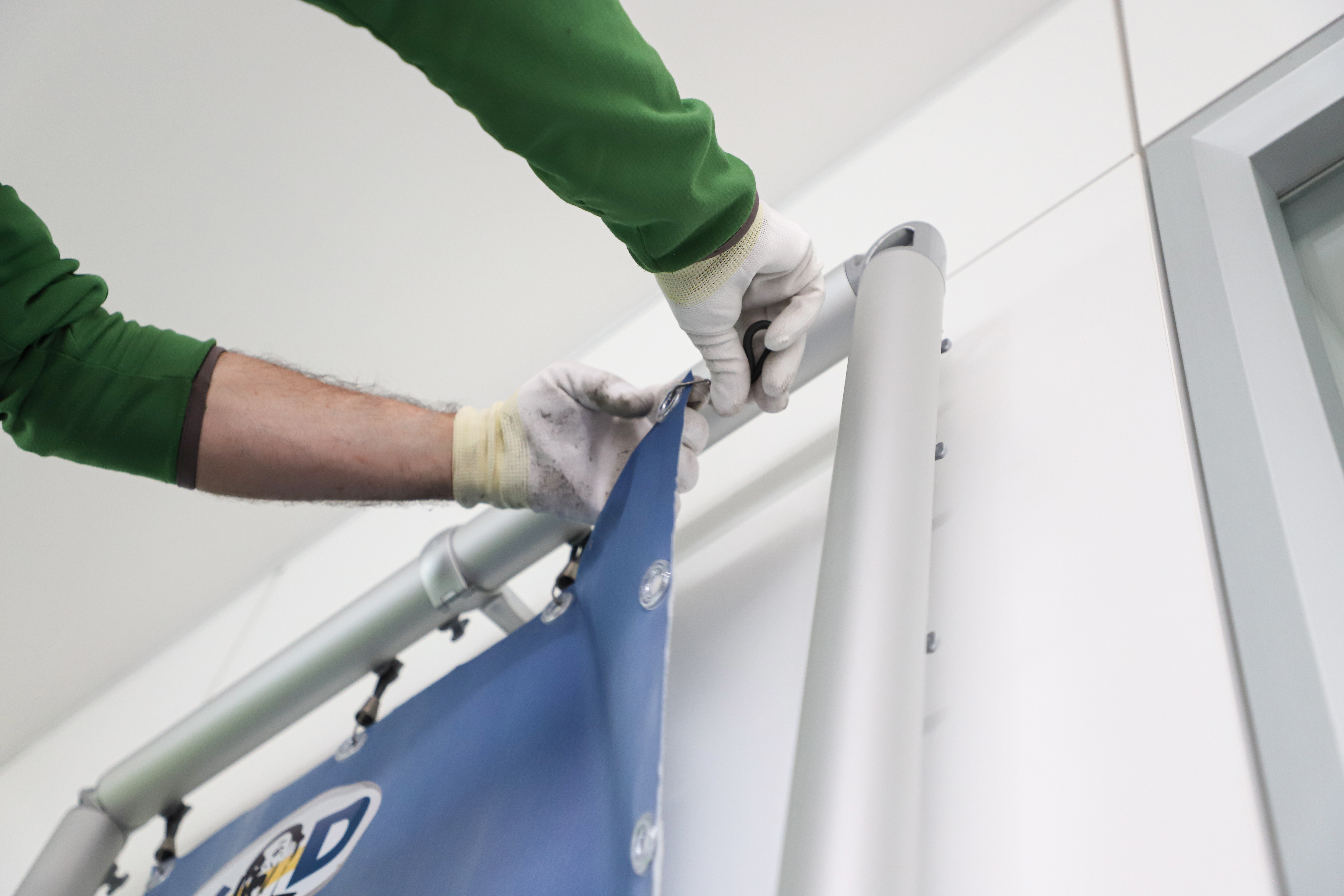 Silbermatt eloxierte Aluminium-Profile für Large Format Spannrahmen Monsterframe: für die professionelle Befestigung von geösten Bannern an Fassaden. Unser patentiertes Design ermöglicht Montage und Austausch des Banners von einer einzelnen Person ohne Werkzeug mühelos und schnell. Die Banner werden mit Expanderhaken an den rückwärtig in der Profilnut positionierten Clips befestigt. Die Position der Cips ist flexibel und jederzeit frei positionierbar. Das modulare Monsterframe System ist einfach in der Handhabung bei Transport und Montage – die ideale Lösung für Werbetechniker und Druckereien, die eine zuverlässige und benutzerfreundliche Möglichkeit suchen, großformatige Werbebanner sicher und ansprechend an Fassaden zu befestigen. Ob kleine oder großflächige Anwendungen, unser System bietet maximale Flexibilität und wird individuell von uns aus langlebigem und recyclebaren Materialien gefertigt. Alle Komponenten sind von uns entwickelt und werden in Mitteleuropa gefertigt. So stellen wir sicher, dass nicht nur die Qualität, sondern auch die Nachhaltigkeit an erster Stelle steht.