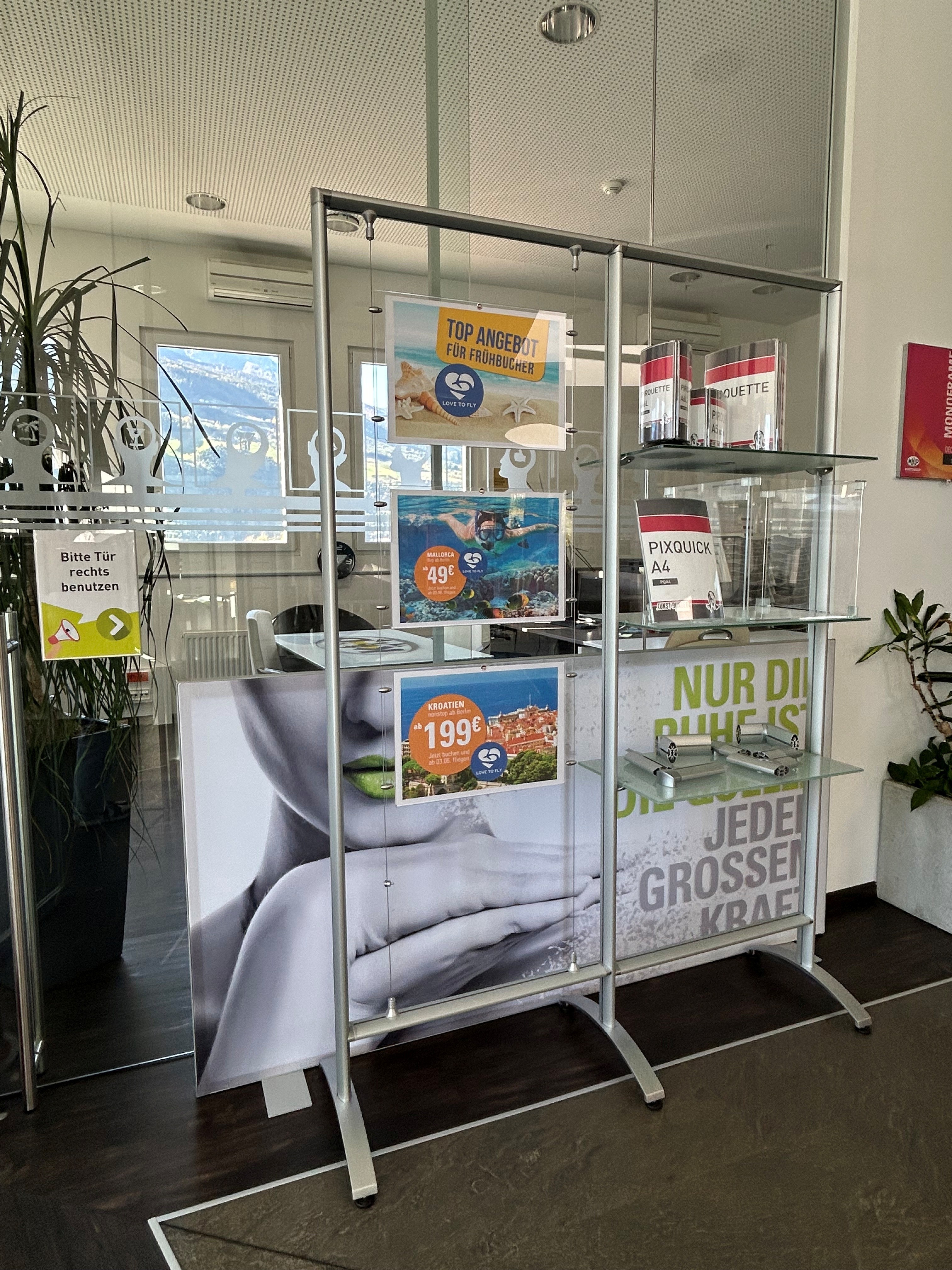 Mobiles Display für Seilspannsystem. Robuster Rahmen aus leichtem Alu auf Rollen, mit Gewindemuttern für die Befestigung von Seilhaltern. Wählen Sie aus dem vielfältigen Angebot der Fly Serie und gestalten Sie Ihr individuelles, mobiles Infodisplay. Material: silber eloxiertes Aluminiumprofil, Ecken in Aluminium-Spritzguss silber, Montage Set.