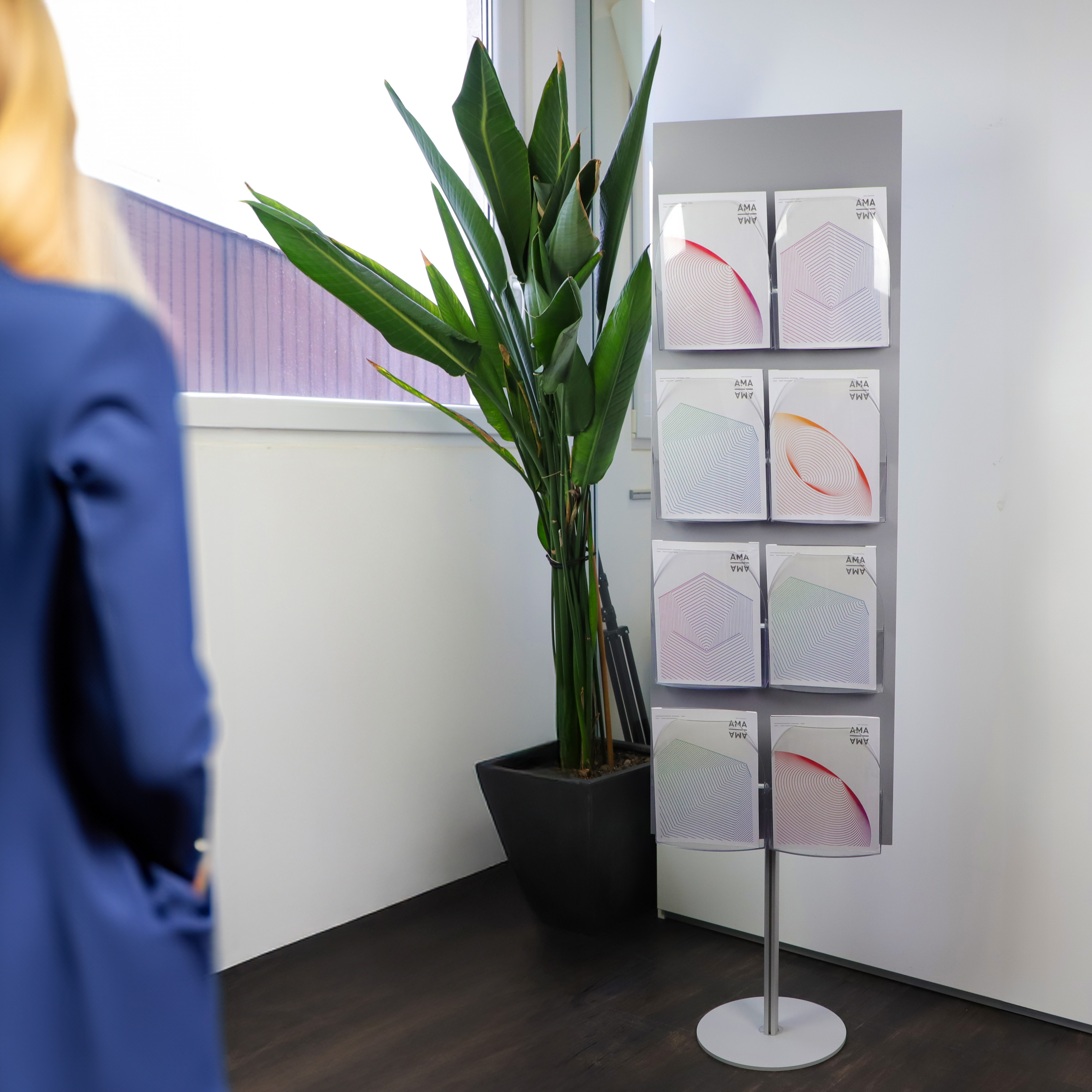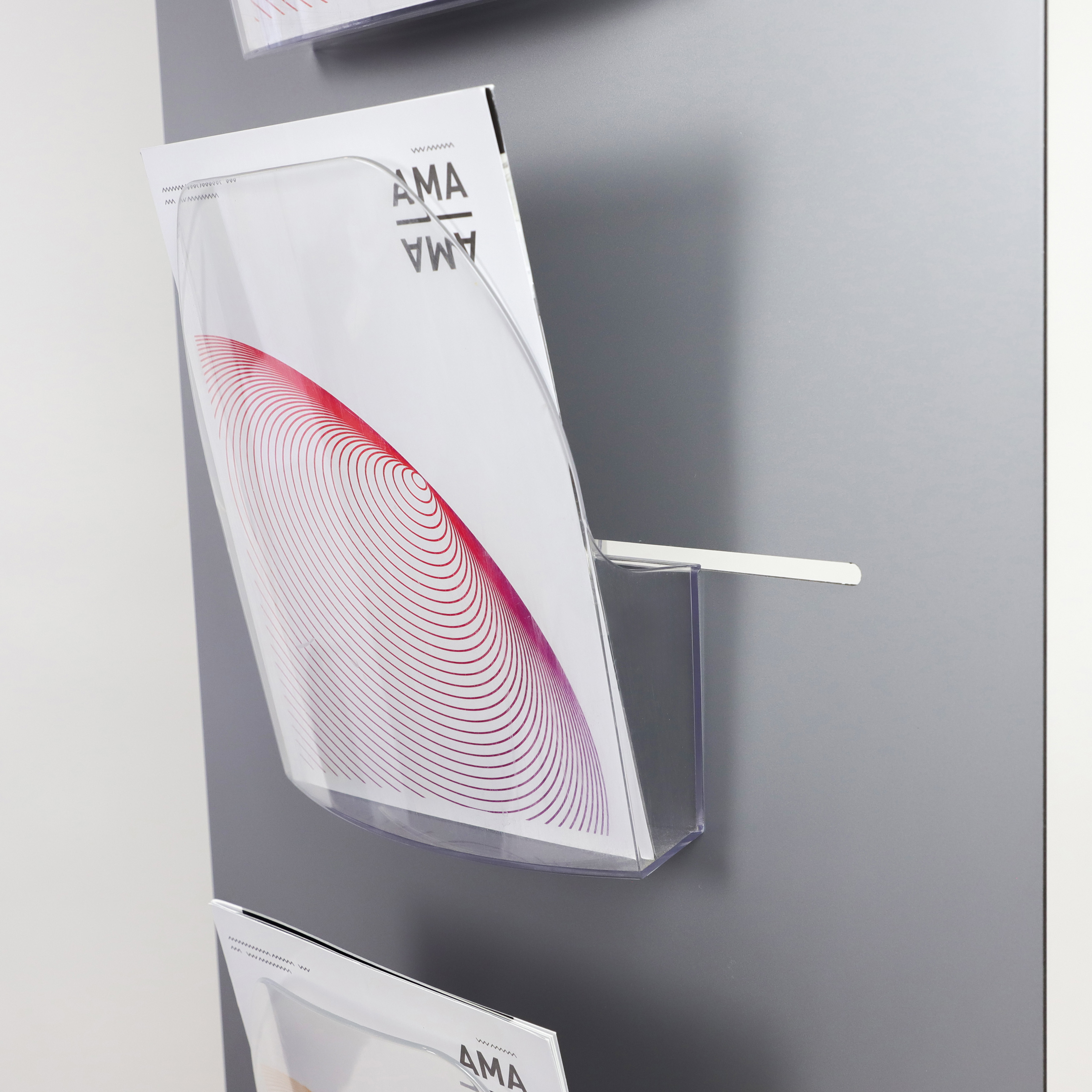 This free-standing brochure rack from the Dacapo series offers flexible organisation: the brochure trays for A4, A5 and A6 formats can be easily inserted, removed and rearranged.