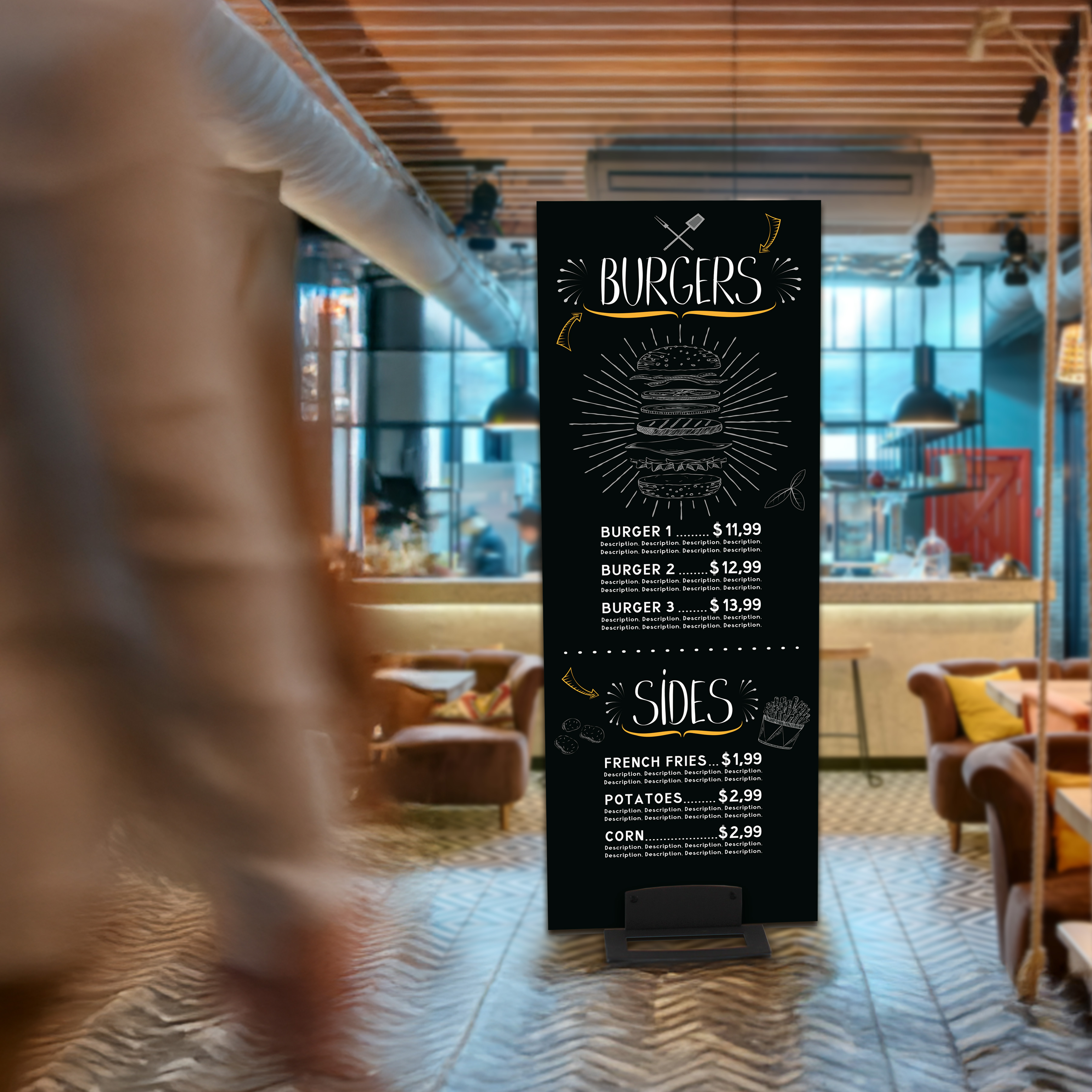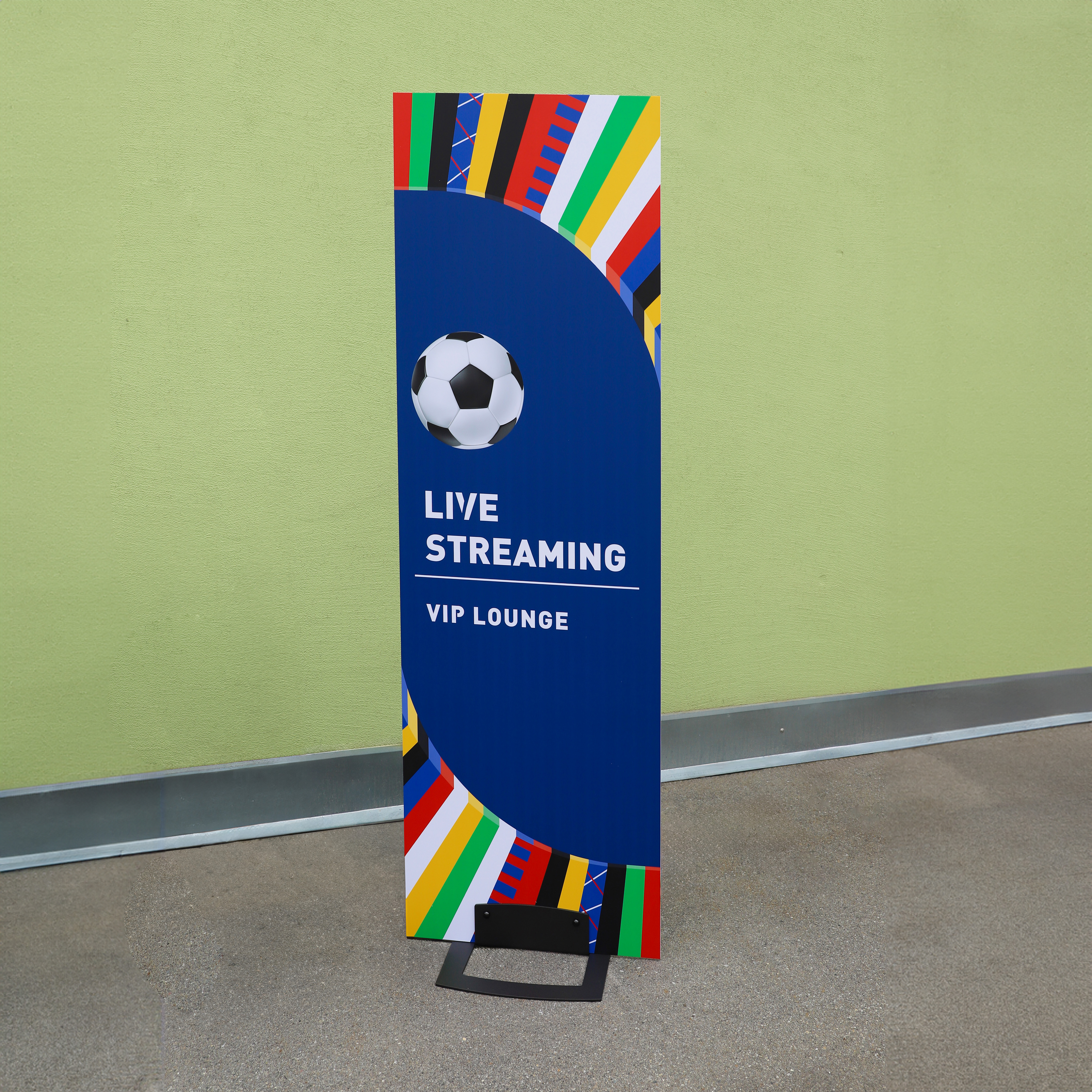 The Quickbase stand made of powder-coated steel with knurled screw transforms panel printing into an attractive stand display and professional advertising display in no time at all.