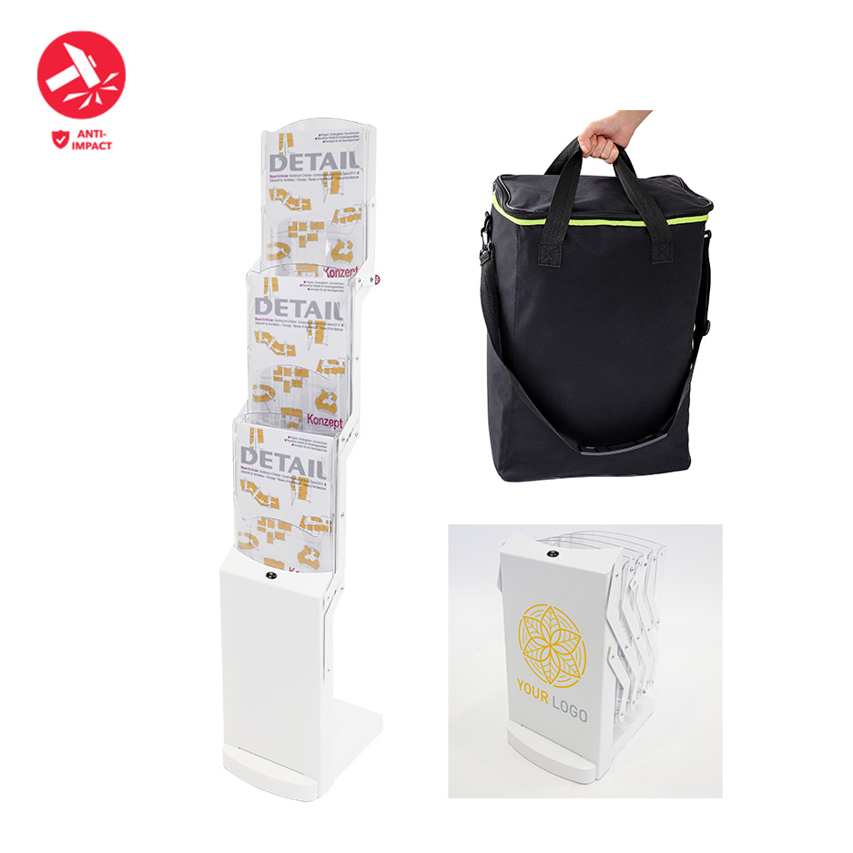Foldable brochure stand in white, three impact- and scratch-resistant polycarbonate pockets for A4 format, powder-coated metal struts, sturdy base made of lacquered MDF.