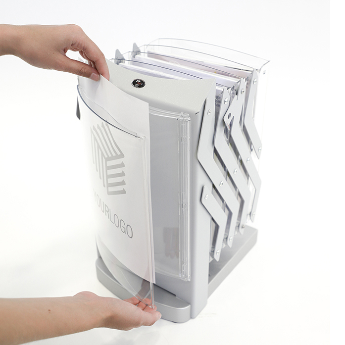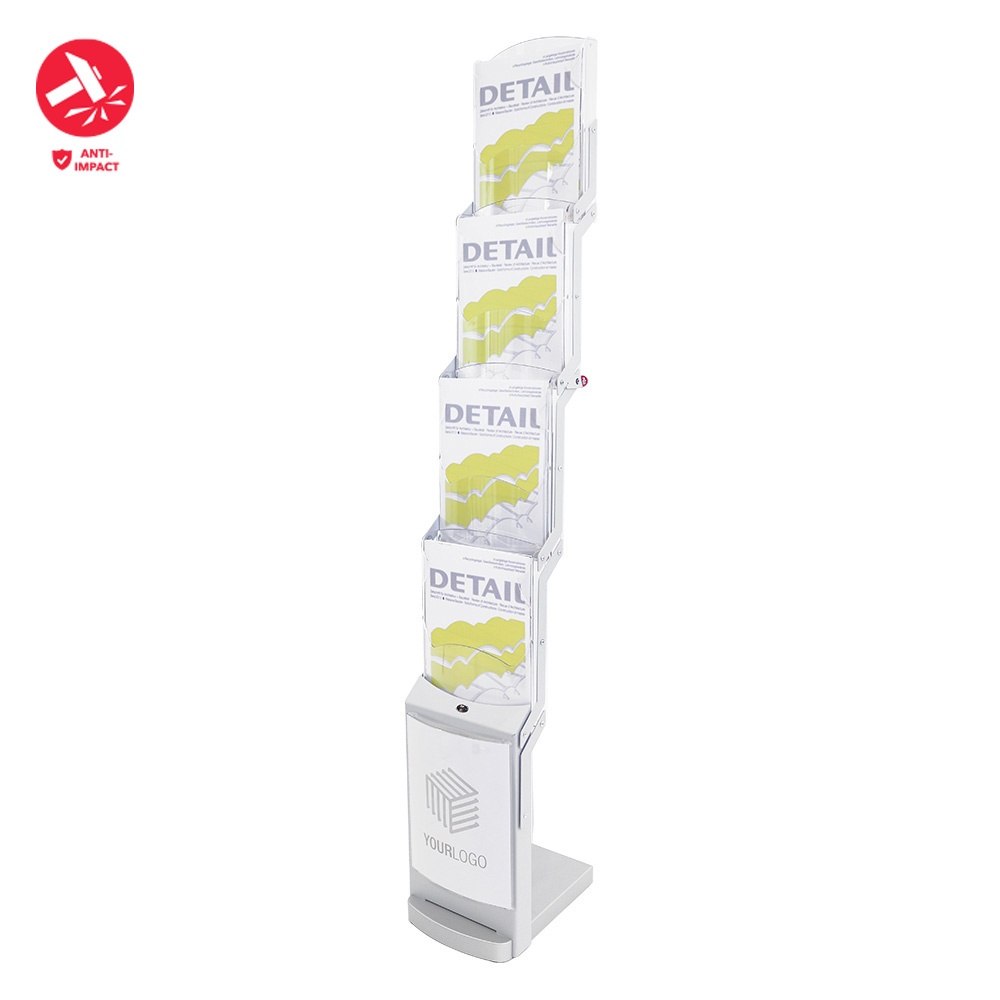 Foldable brochure stand in white with four A4 pockets