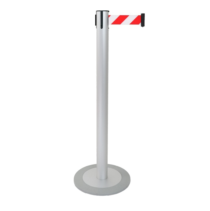 Low-cost barrier stanchion made in Italy in matt silver with strap in red or black.Matt silver anodised aluminium post: easy to clean, fingerprints and water droplets remain invisible.The belts for the barrier posts are woven in Germany especially for us. The dyed-through yarn is highly lightfast, crease-resistant and dirt and dust-repellent.Safe crowd control system: the centrifugal brake ensures controlled belt retraction without risk of injury. In the event of a major impact, the safety lock opens automatically.All components of our barrier belt systems are manufactured in Germany or northern Italy by long-standing family-owned partner companies according to our specifications. Assembly and quality control take place in our factory in the Italian Alps. Our barrier posts with belts are robust and durable – ideal for long-term use at events and trade fairs.We stand for continuity, because our models are available on a long-term basis. Reorders for replacement or expansion are possible even after many years.As the manufacturer, we naturally offer suitable spare parts for any repairs of the queue management components.Our tip: Logo printing on the belt is available from a quantity of 1 in just a few days.