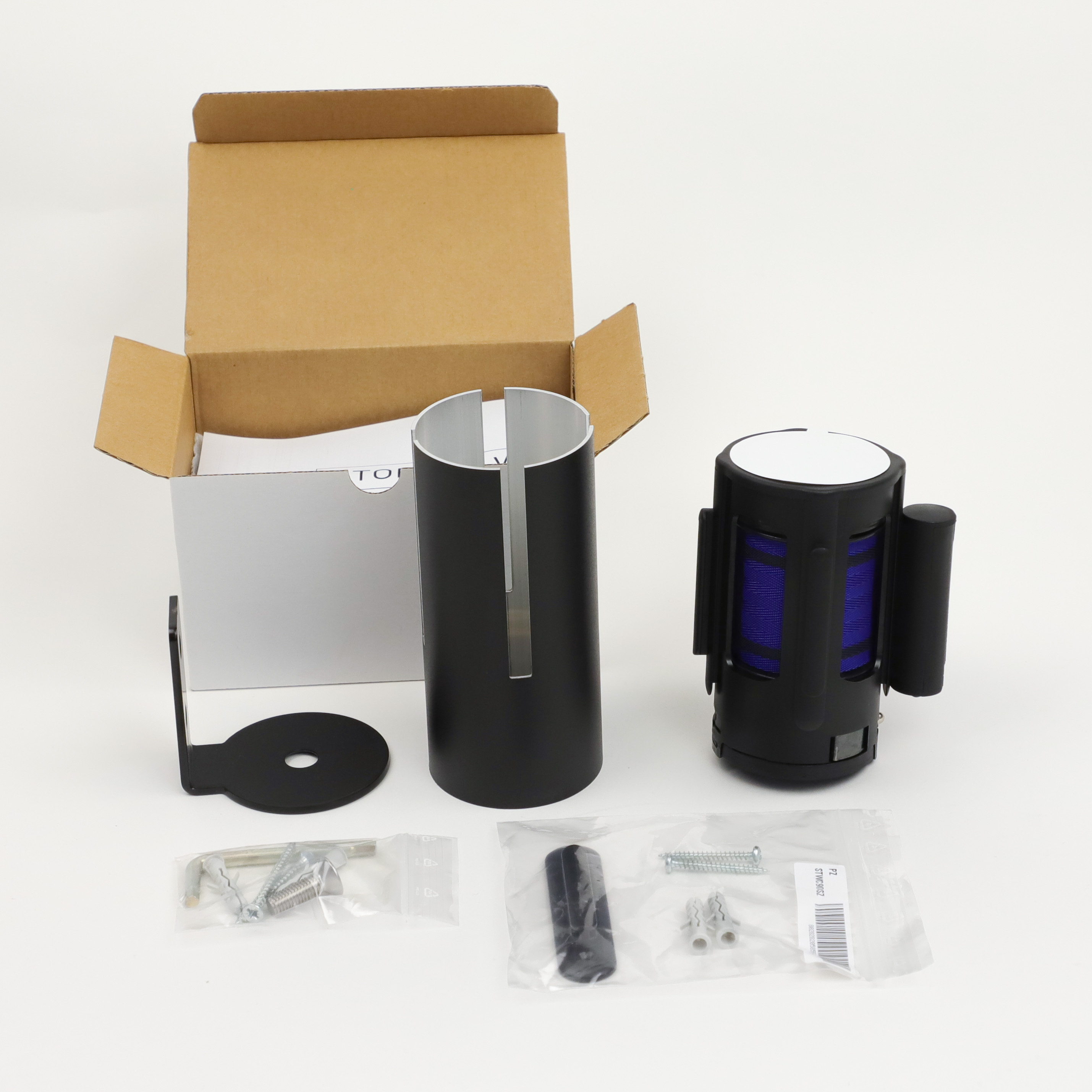 The product includes the wall bracket, belt sleeve, belt cassette in the selected belt colour, wall clip for hanging, wall screws and dowels for normal masonry.