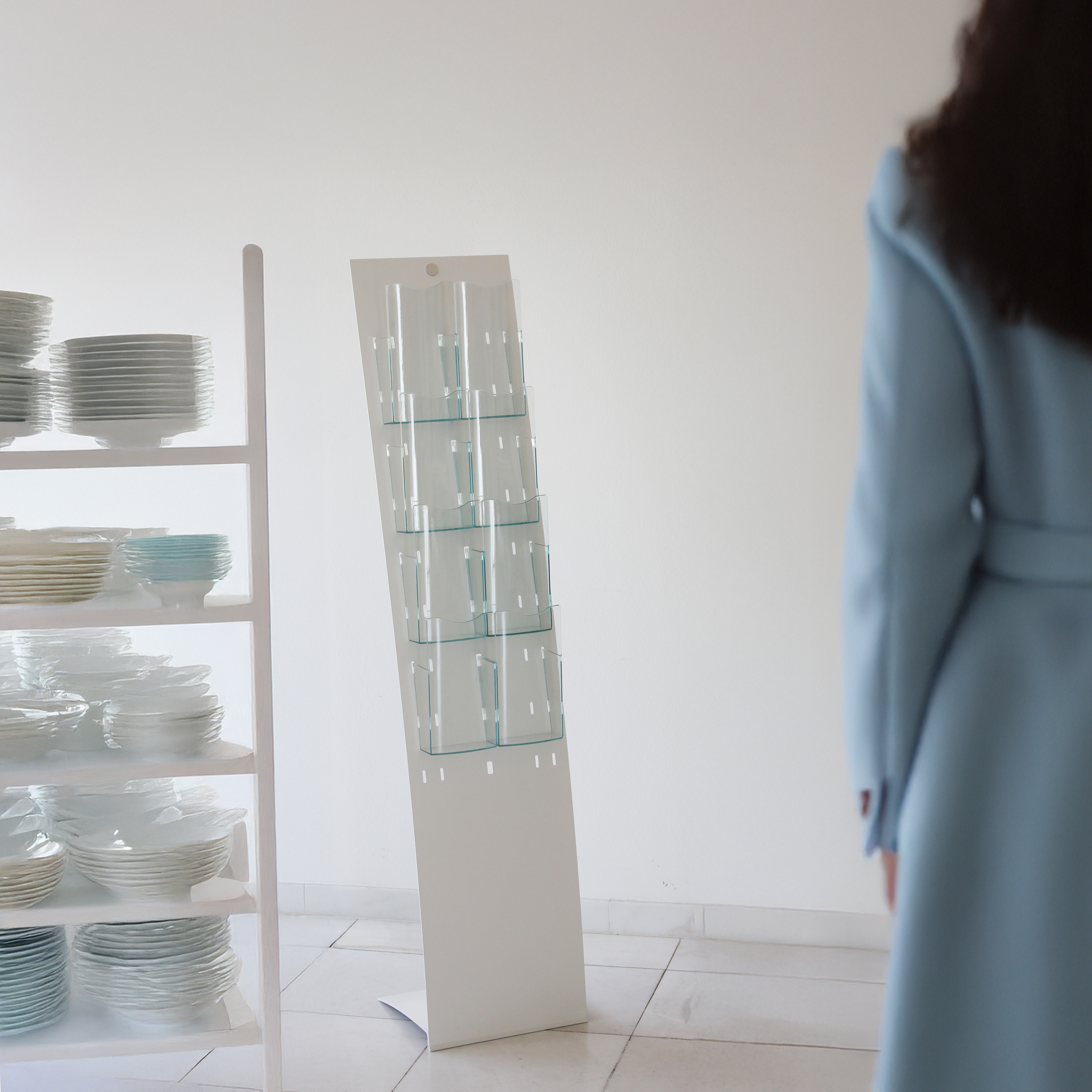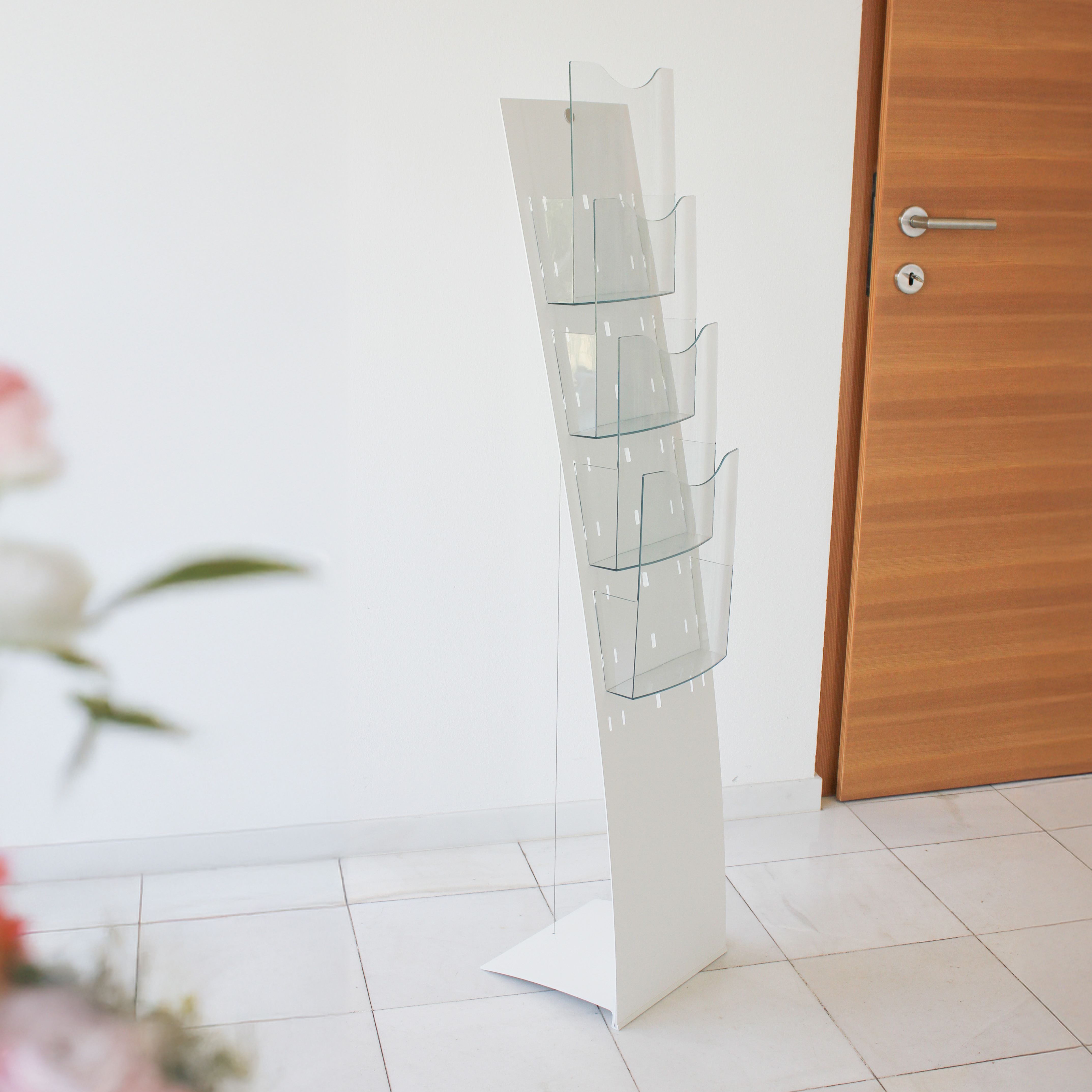 An elegant and flexible brochure stand with a trendy white look. The two-part basic structure of the Velo Magic Restyle is quick to assemble: simply insert the metal panel into the aluminium base and fasten with the tensioning cable. The panel has special milled grooves so that you can easily insert and remove the brochure compartments from the Magic range for A4, A5 or A6. The free-standing floor display made of matt white powder-coated steel is magnetic and can be used as a free-standing brochure stand for various print formats or as a small product presenter with the Magic clean shelf.