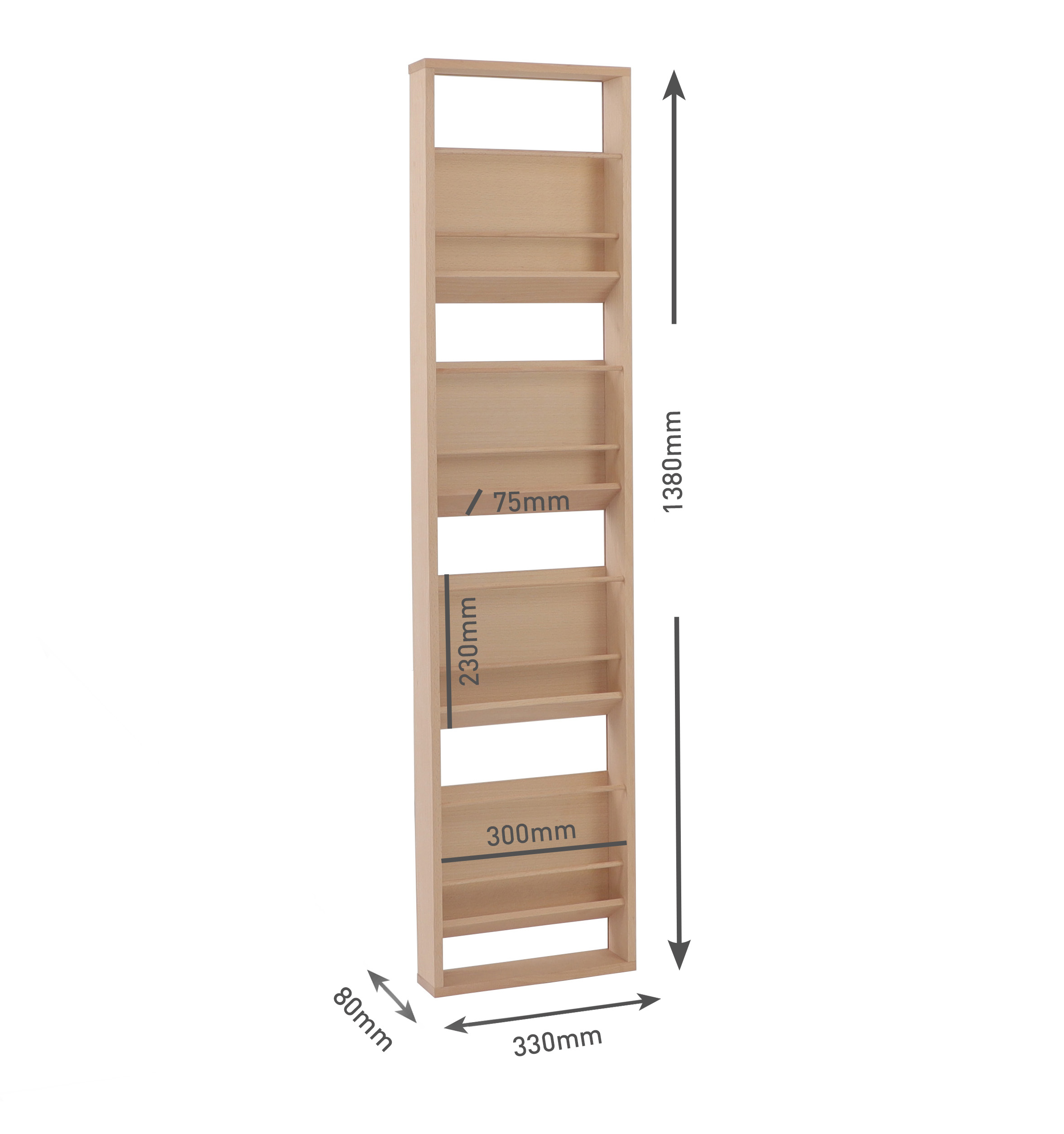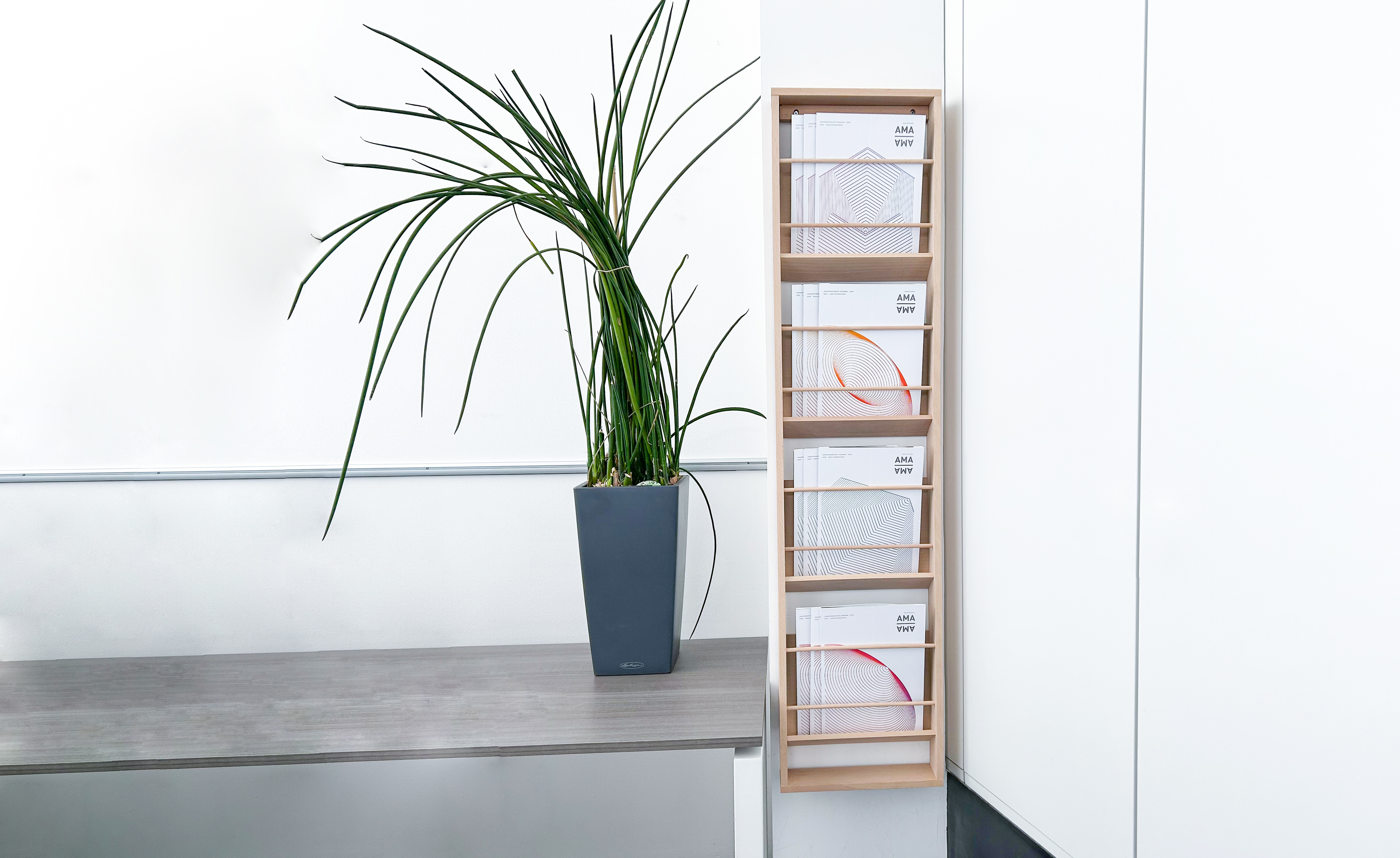 Made from European beech wood and regional production, Wood Mate is the perfect partner for ecological catalogue presentation on the wall. Four large compartments offer sufficient storage space for magazines, flyers and brochures in A4 vertical format. Thanks to the sloping shelves, the printed media are clearly visible right down to the last copy and perfectly within reach for easy removal.