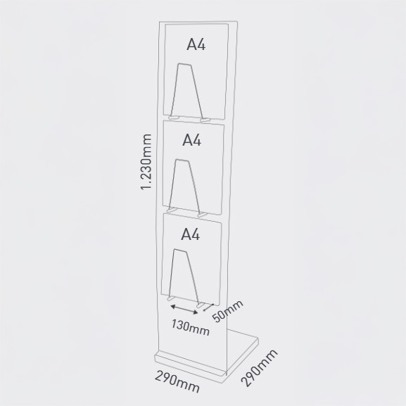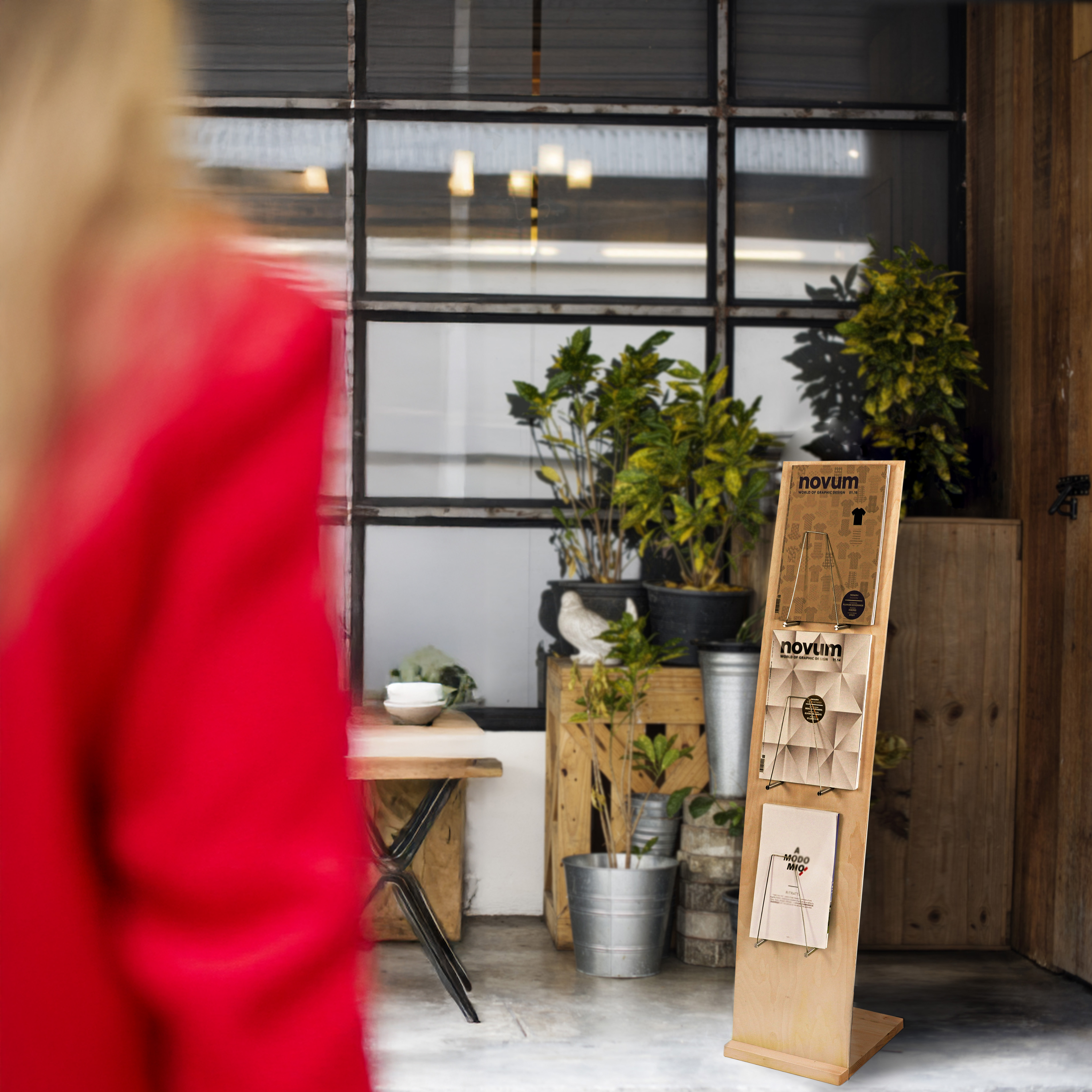 Freistehender Prospektständer mit 3 Abteilungen für A4 und A5 in Hoch- und Querformat aus Holz und Edelstahl.